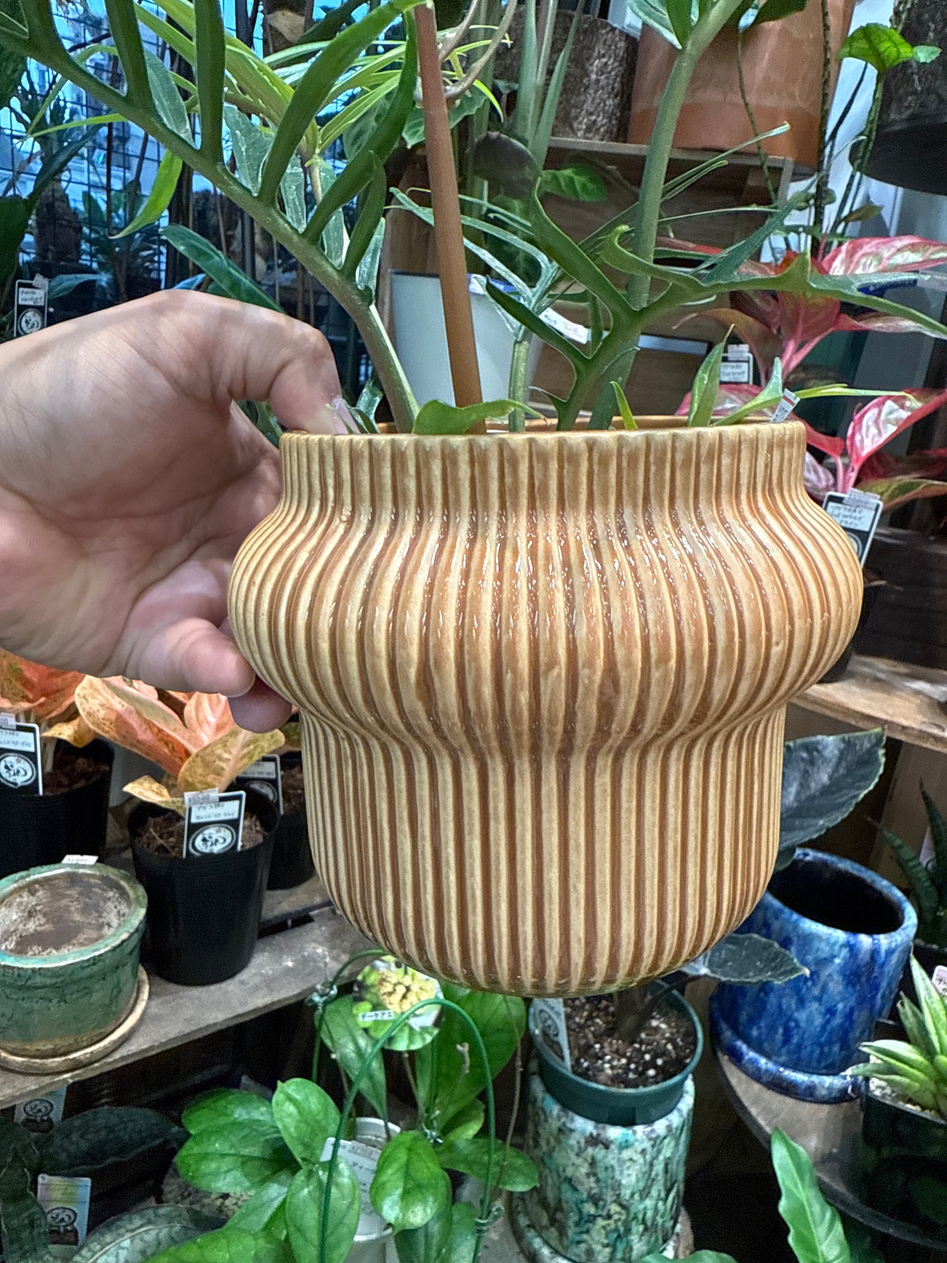 ストライプベージュ 陶器コーティングカバーポット